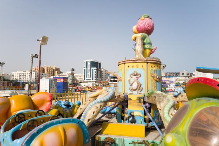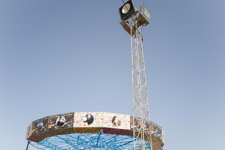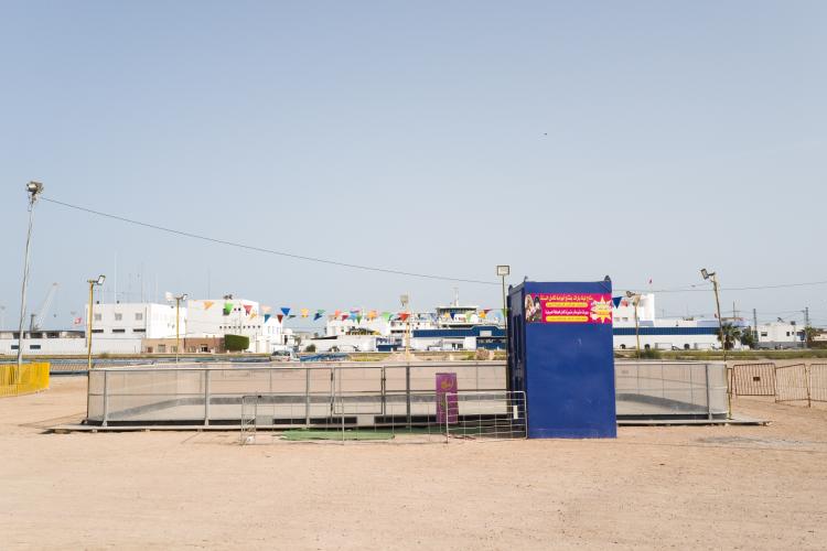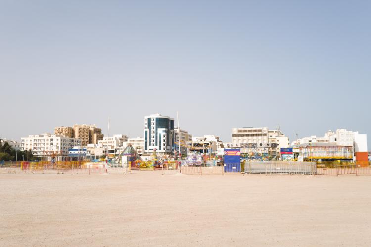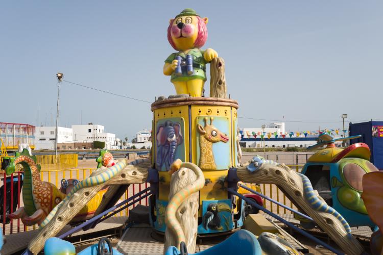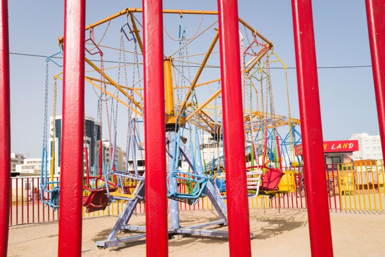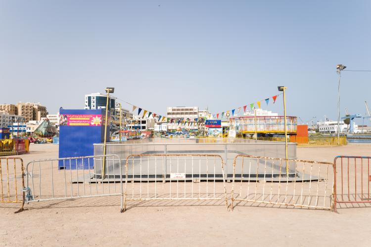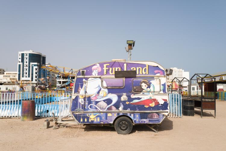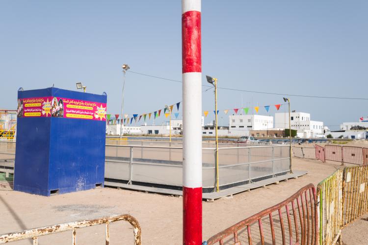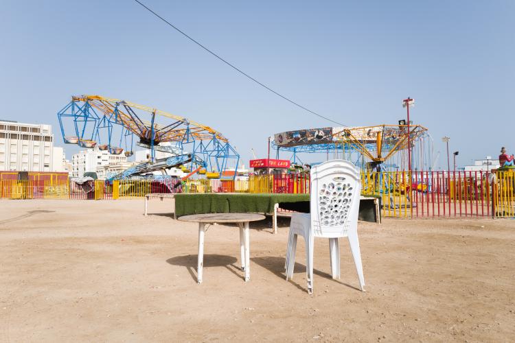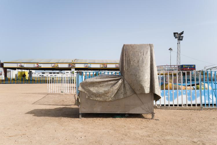La fete foraine est finie, la machine a barbapapa est emballee dans un tissu gris en attendant d etre louee, des chaises entassees, le sable sans trace de pas, en cette rentree les enfants sont de retour a l ecole. Le terrain avec les maneges est bien vide, seul quelques forains restent sur place. Tunisie, Sfax le 19 septembre 2023