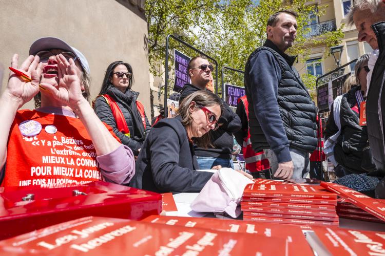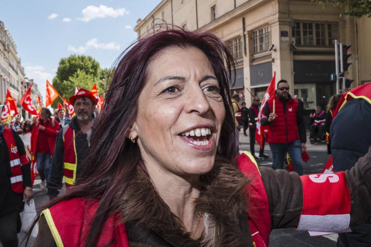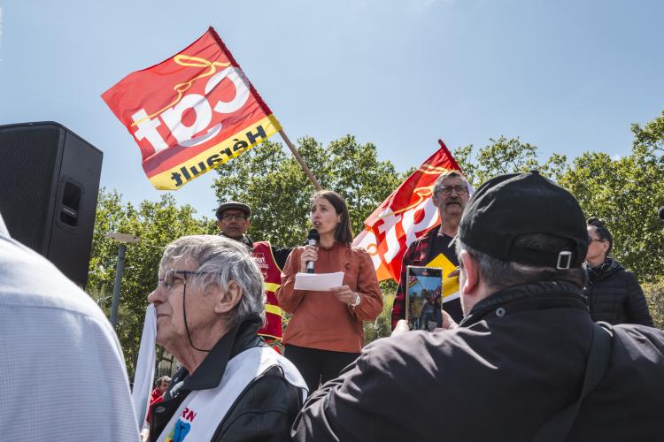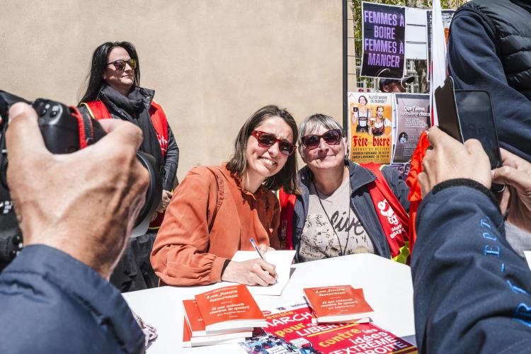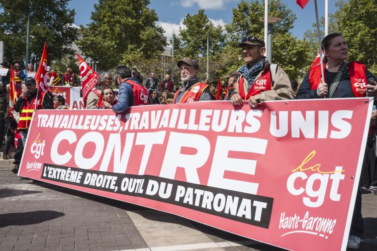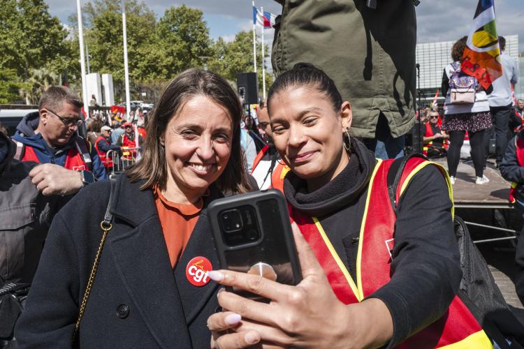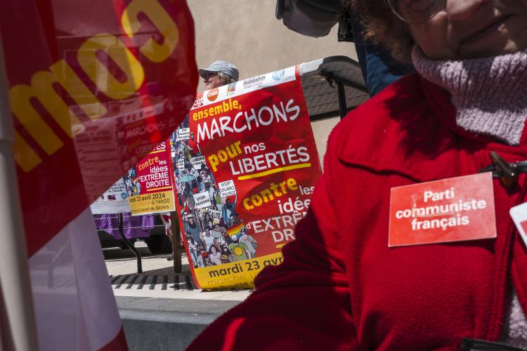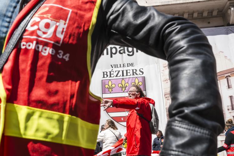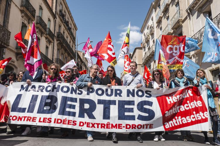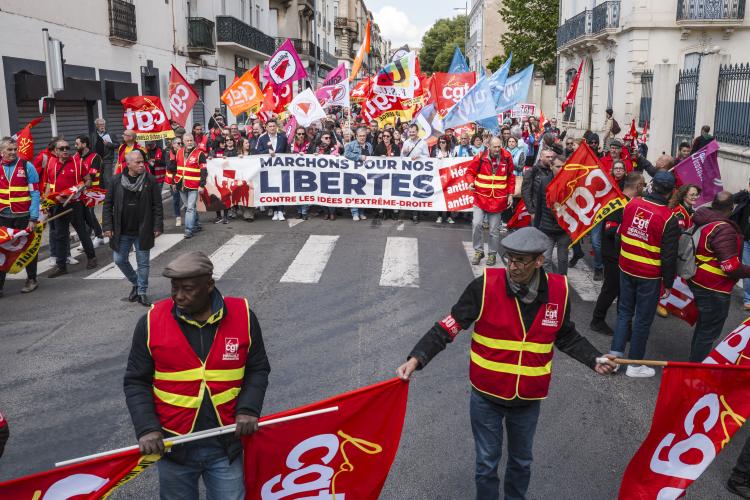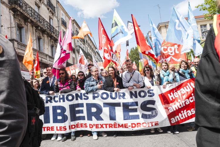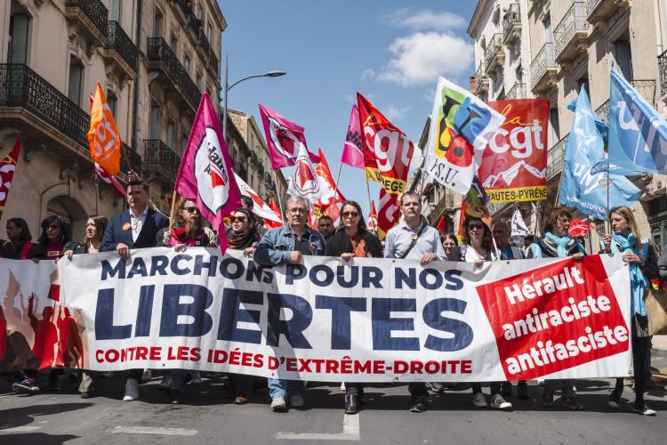 Marche unitaire pour nos libertes et contre les idees d extreme-droite, en presence de Sophie Binet, secrétaire nationale de la CGT, organisee a Beziers par des syndicats et associations. France, Beziers le 23 avril 2024.