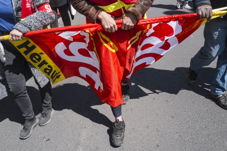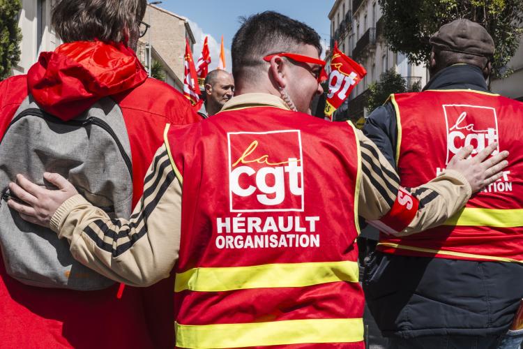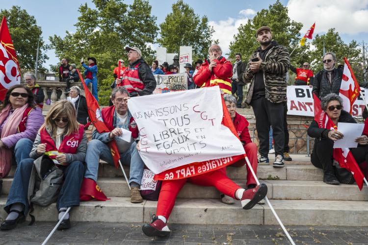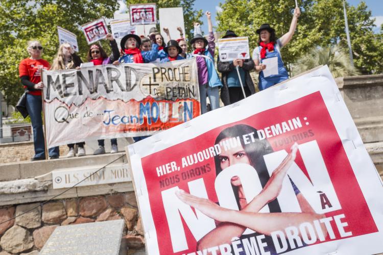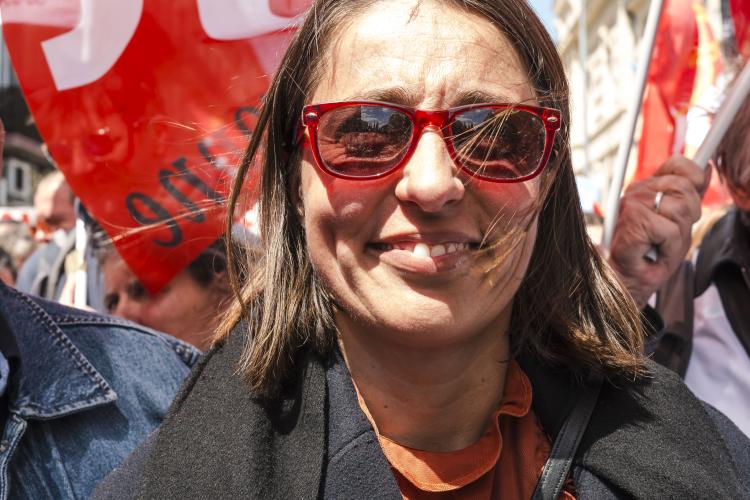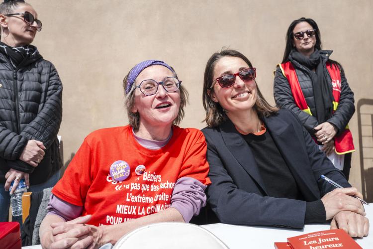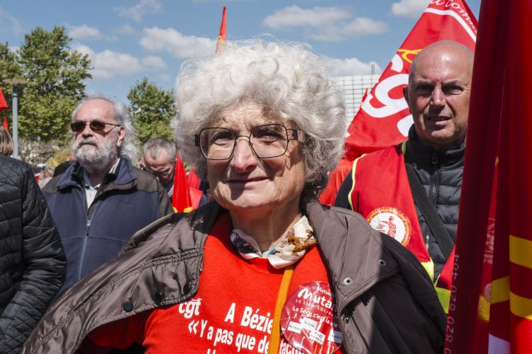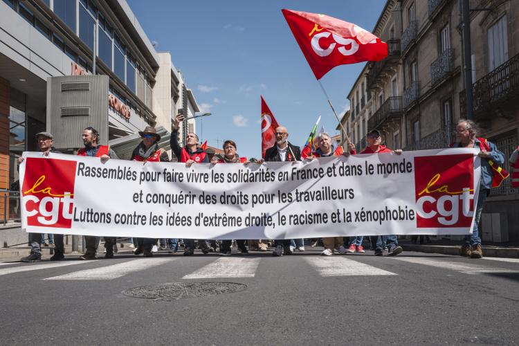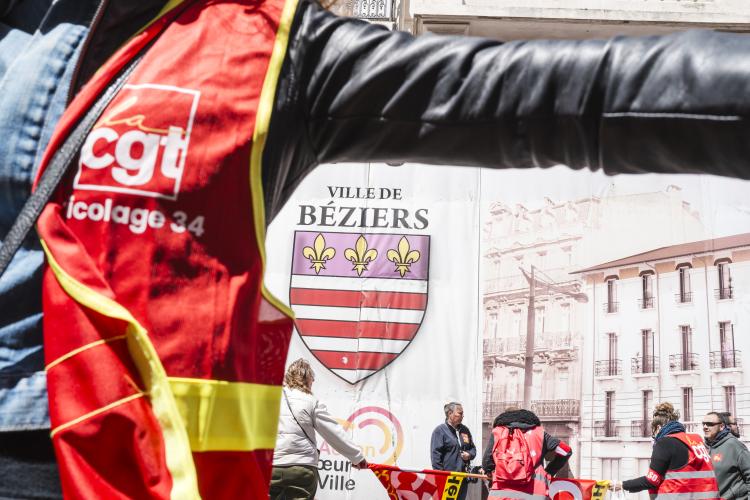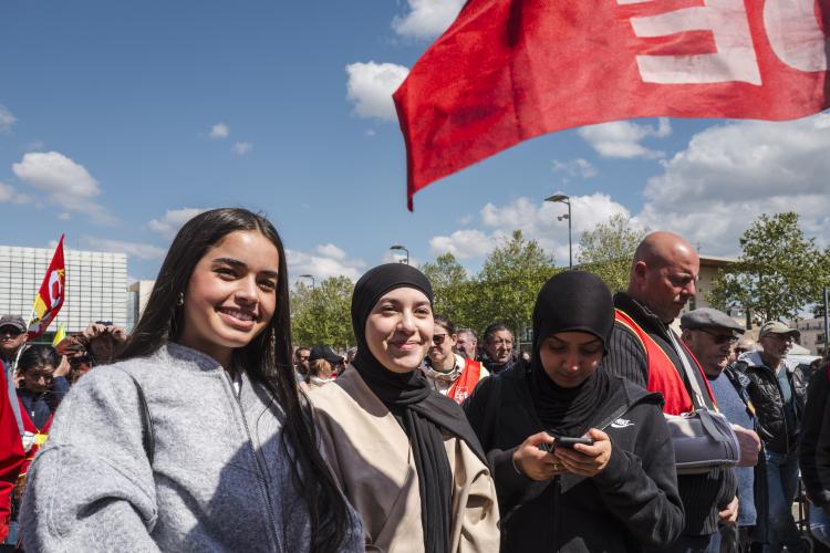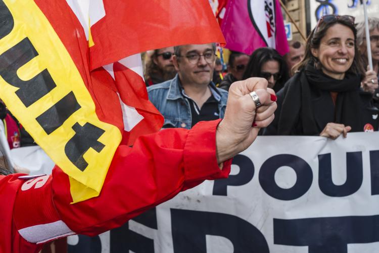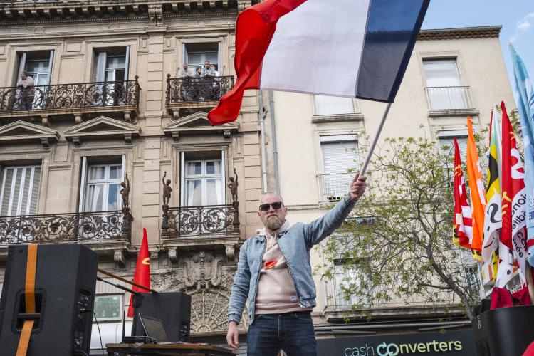 Marche unitaire pour nos libertes et contre les idees d extreme-droite, en presence de Sophie Binet, secrétaire nationale de la CGT, organisee a Beziers par des syndicats et associations. France, Beziers le 23 avril 2024.
