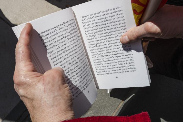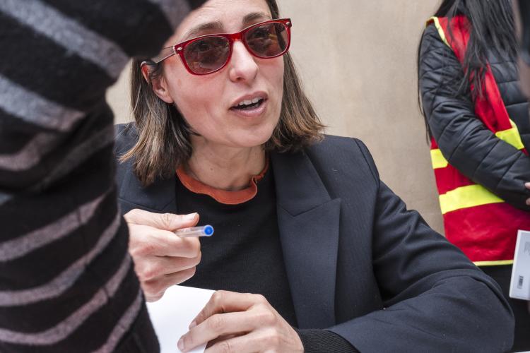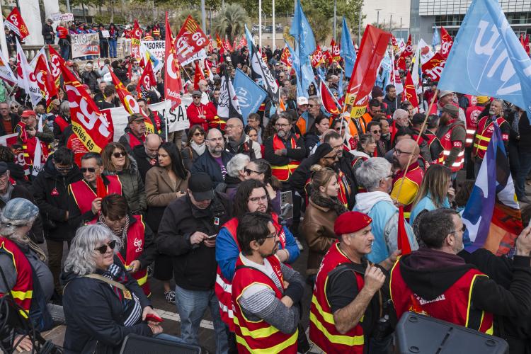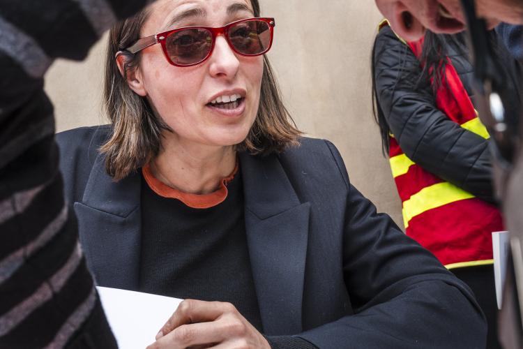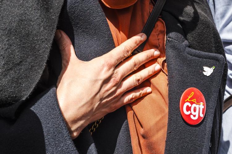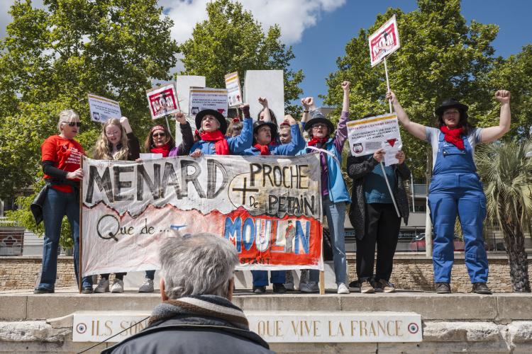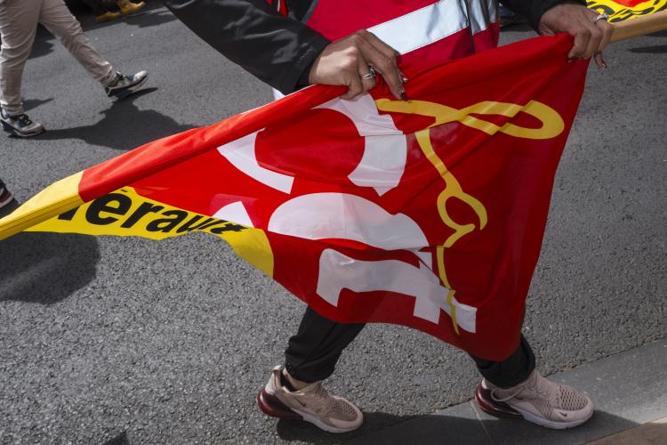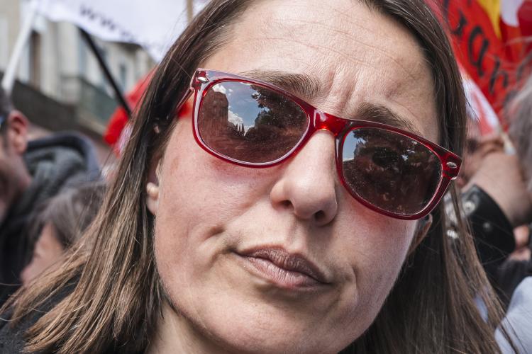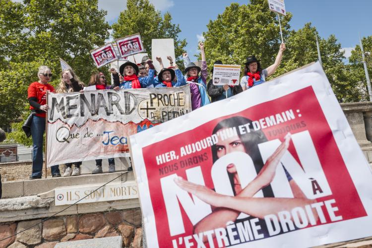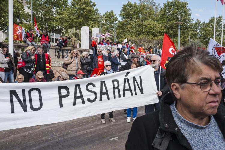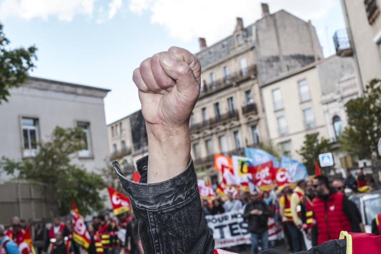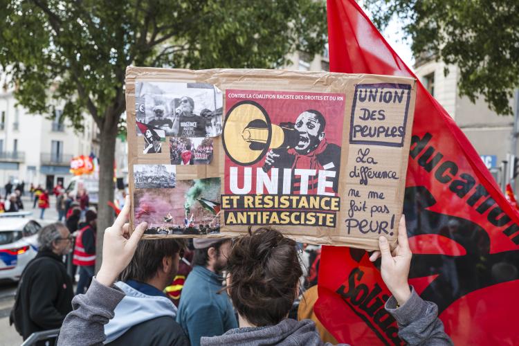 Marche unitaire pour nos libertes et contre les idees d extreme-droite, en presence de Sophie Binet, secrétaire nationale de la CGT, organisee a Beziers par des syndicats et associations. France, Beziers le 23 avril 2024.