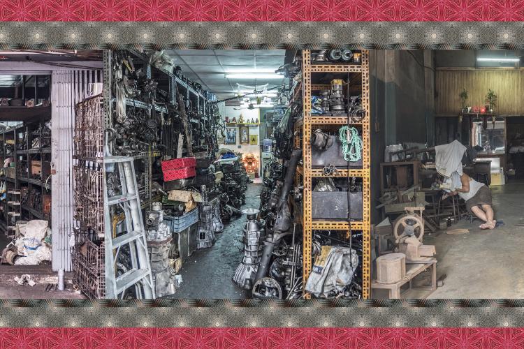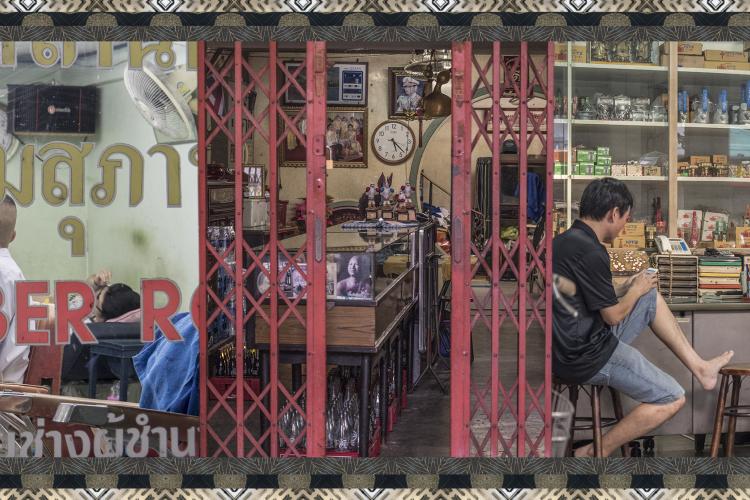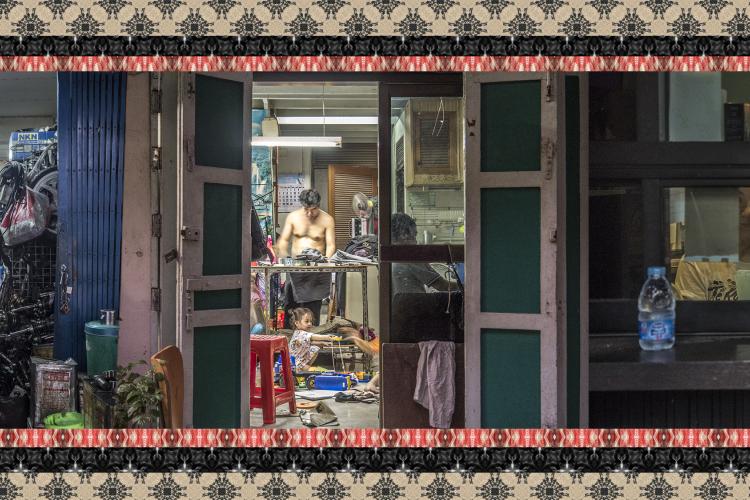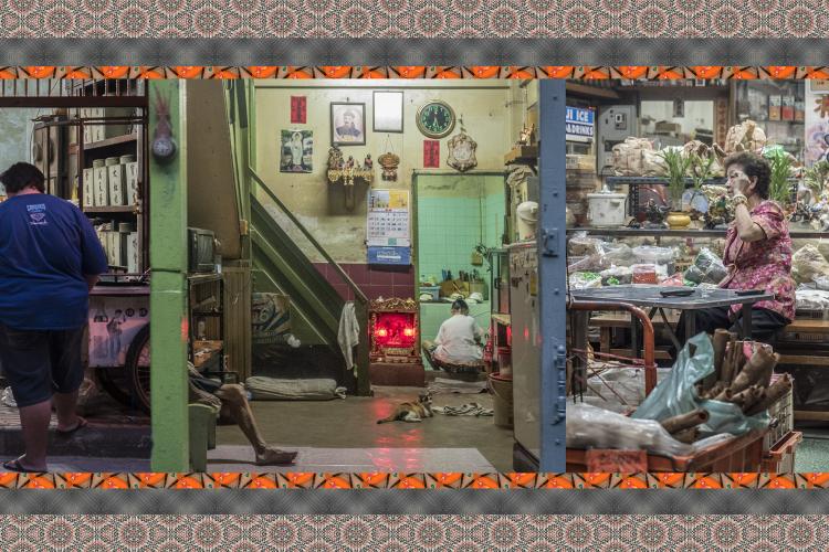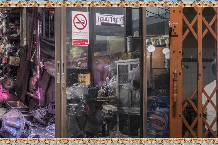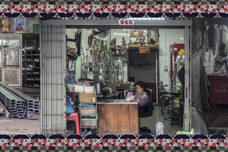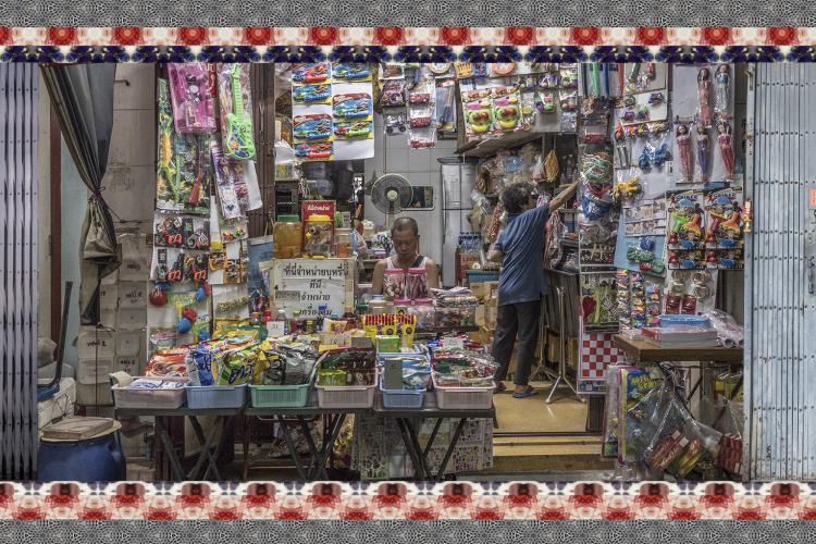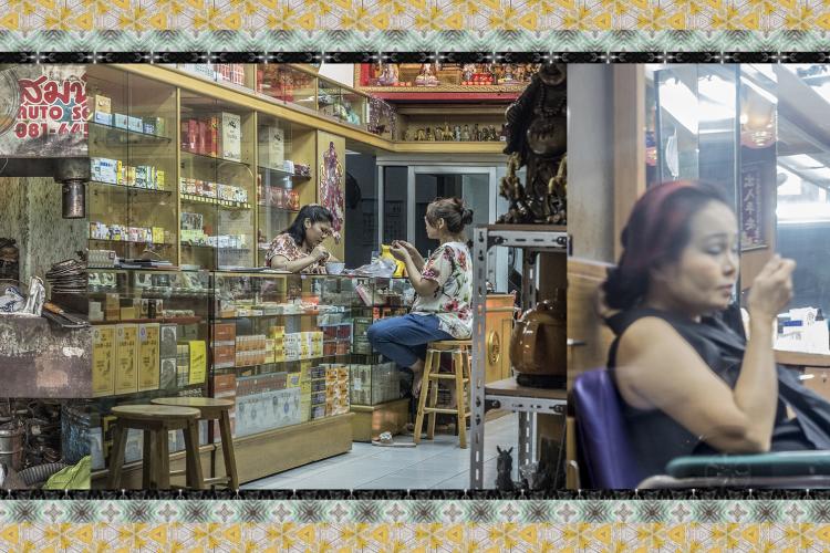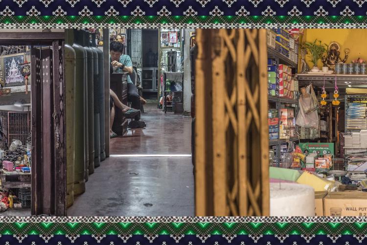 En résidence à Bangkok pendant deux mois, j’ai habité et travaillé dans le quartier chinois aux rues typiques où les ateliers-maisons se succèdent : de petites échoppes mono-produit constituées d’un étroit magasin en rez-de-chaussée, une cuisine rudimentaire et une douche au fond, des dortoirs sommaires aux étages. Les commerçants et leurs familles y travaillent et y vivent sous le nez des passants : la frontière entre vie publique et vie privée est totalement effacée.